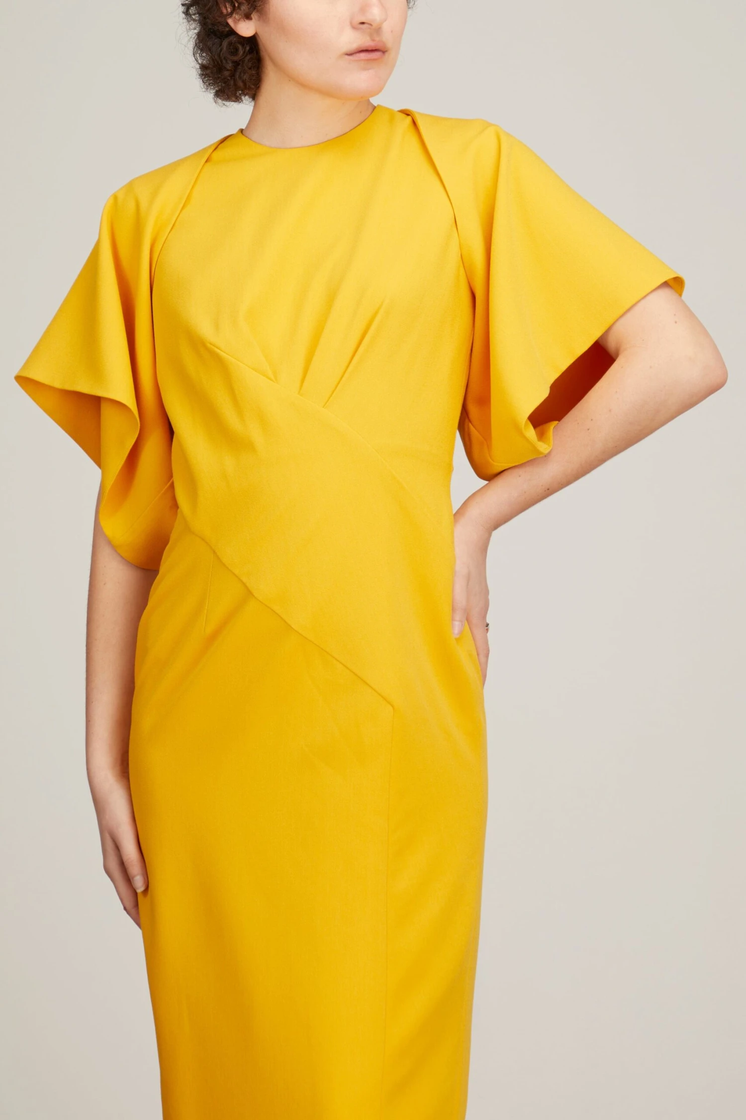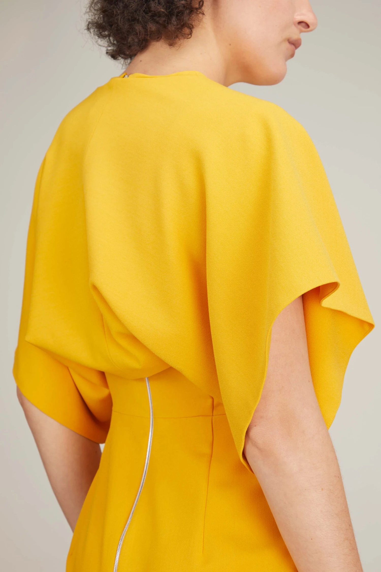 E.STOTT has designed a collection of detachable sleeves and additions so you can customise garments new and old. If you can wear something in more than one way, for different occasions, youll keep it longer and benefit the environment. The E. Stott Buea is an ochre colored silk-satin addition that is draped generously through the arms it’s a perfect addition to E.STOTT Mila dress.