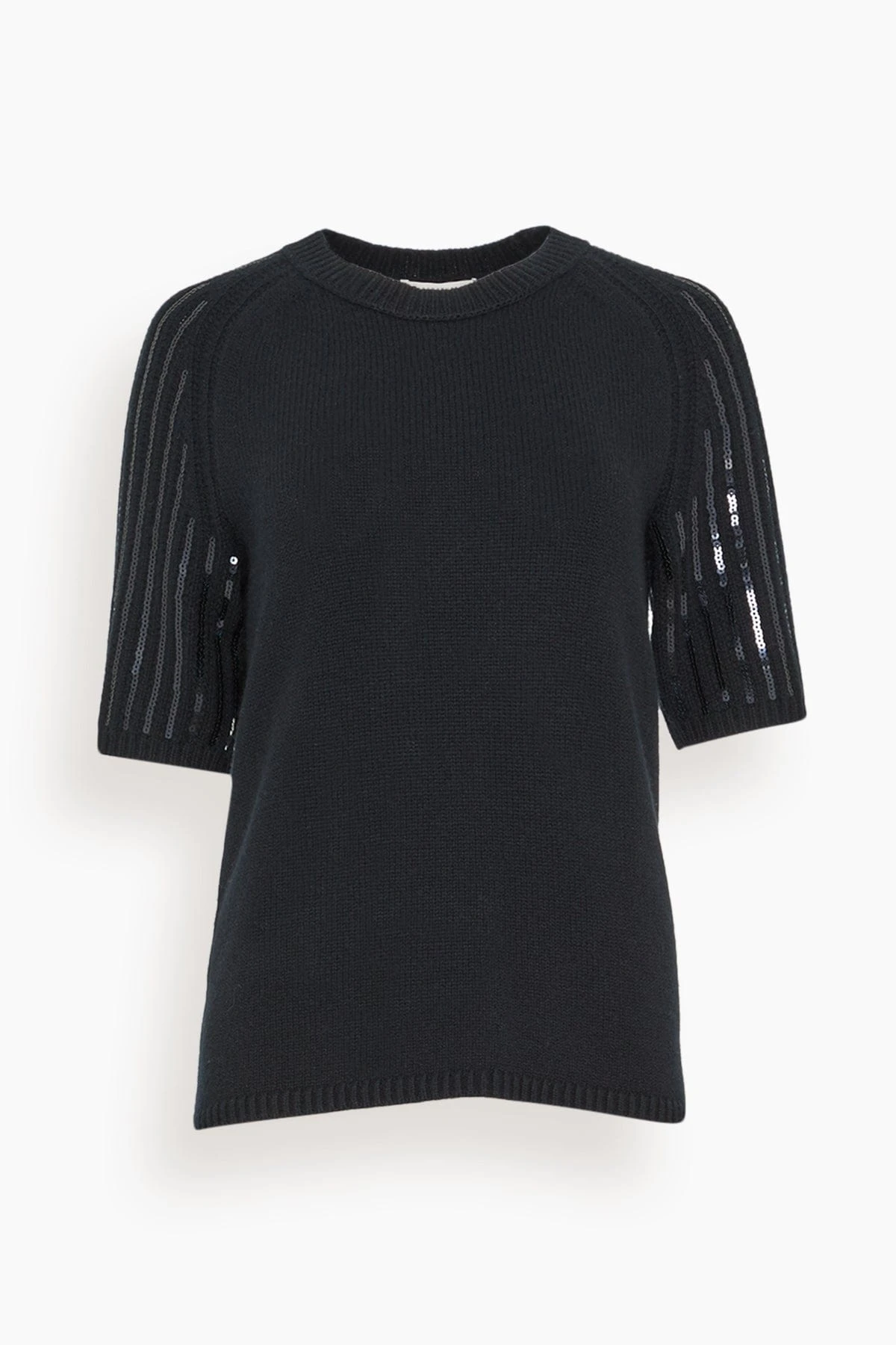 The sweater made of merino and cashmere is especially soft to the touch. The short sleeves are embellished with rows of sequins.