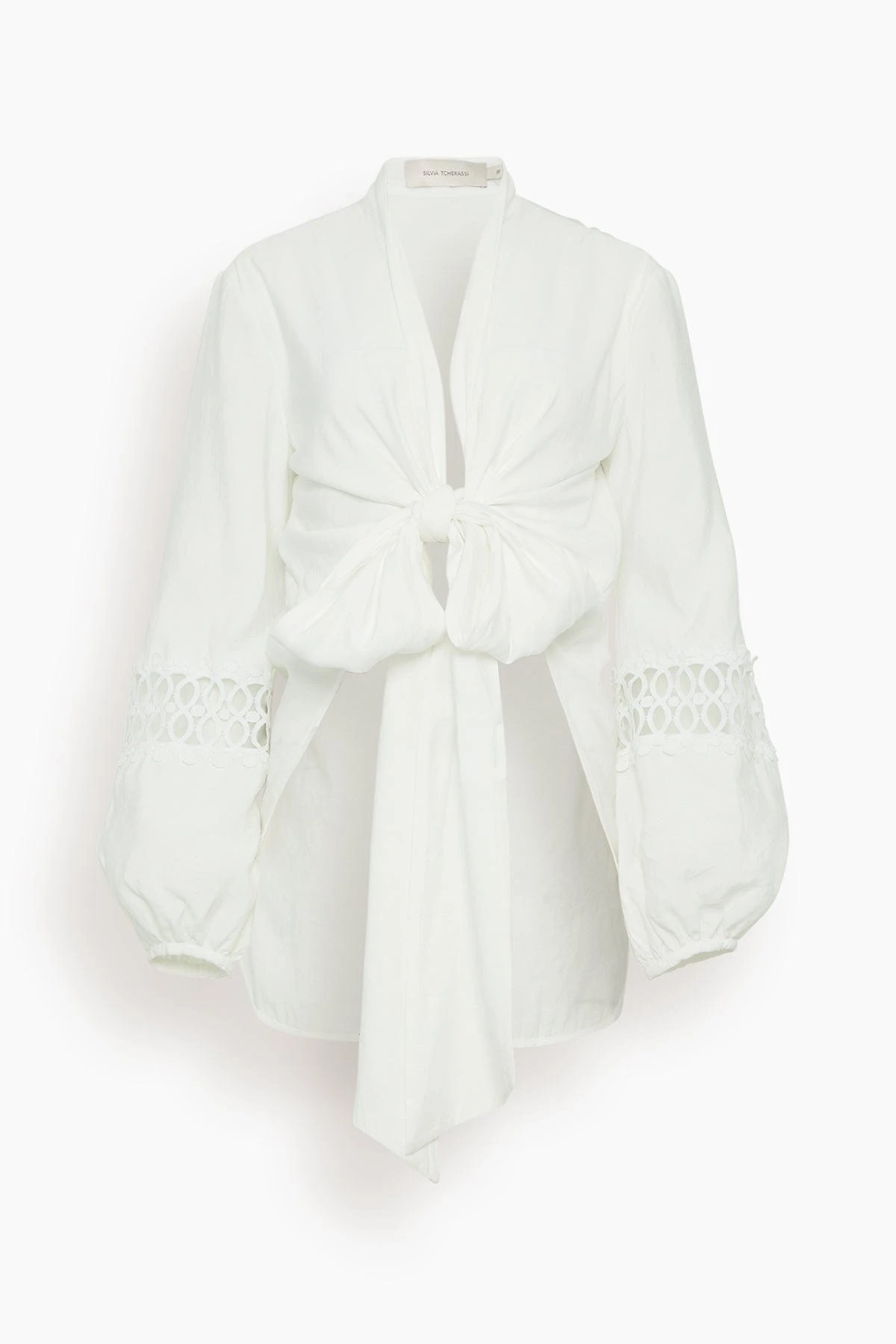 The Silvia Tcherassi Irme Blouse features their signature silhouette. You’ll love the deep v-neckline with tie detail of this cotton poplin blouse with organza sleeves. Wear yours with the matching skirt and heels.