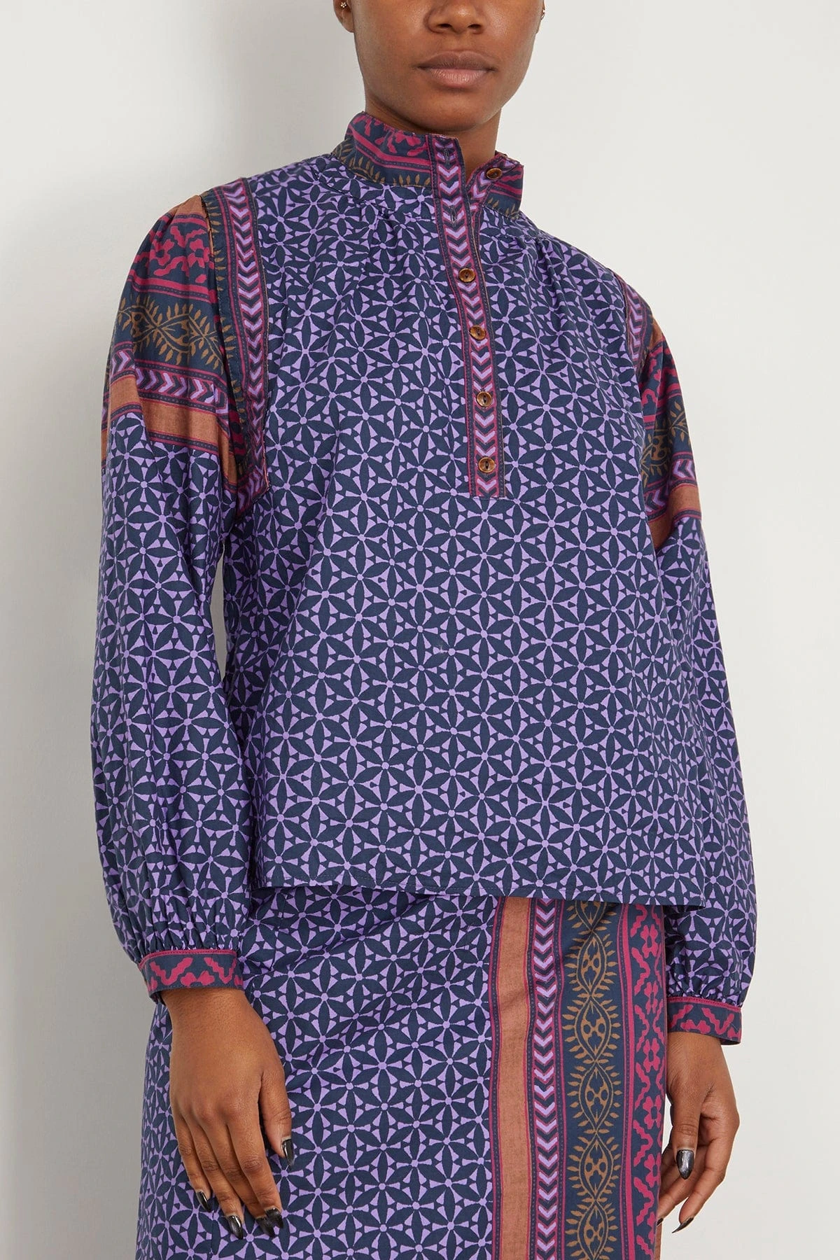 The Xirena Izzie Top is crafted in their must-have mosaic print. You’ll love the relaxed fit of this top with a concealed half button front and blouson sleeves. Wear yours tucked in to jeans with loafers.