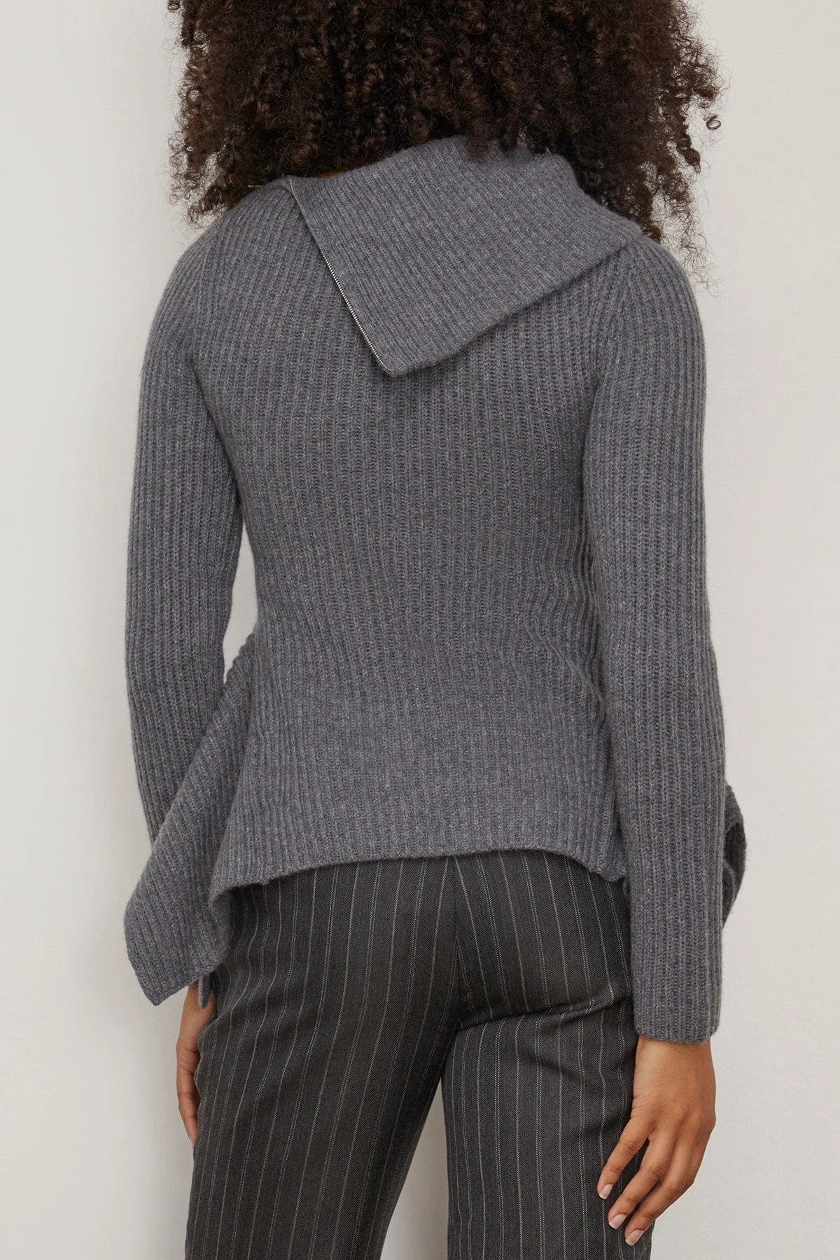 The Simkhai Keyara Foldover Collar Peplum Sweater features an asymmetric peplum waist, a turtleneck, and a hem that hits below the hips. We love it paired with a classic slip skirt and boots.