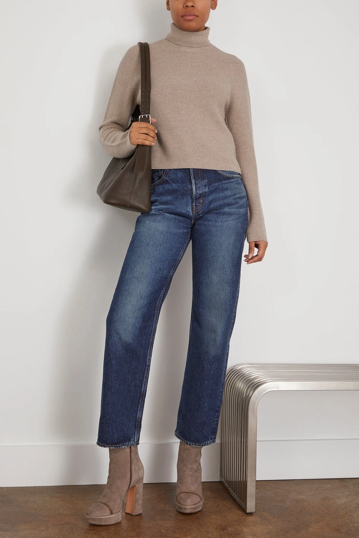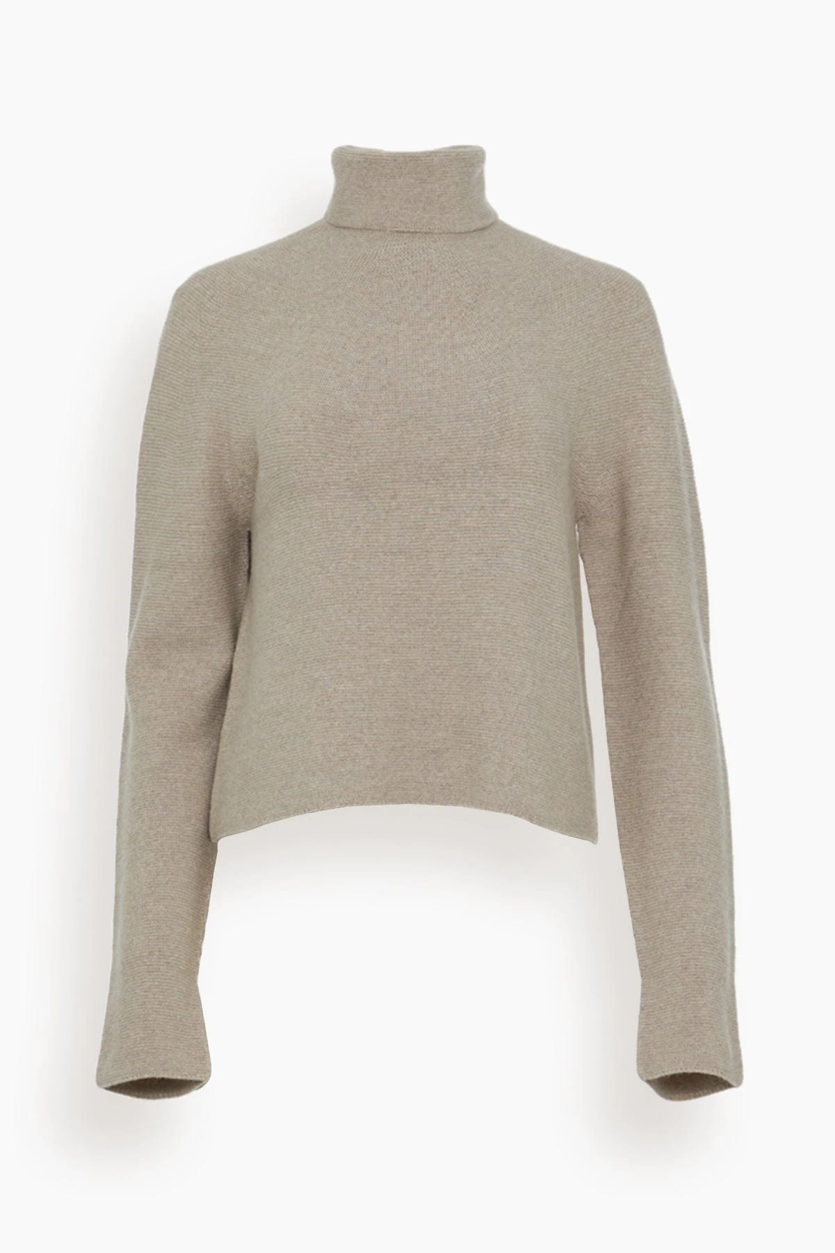 The Christian Wijnants Kolkati Sweater in Stone is a whole garment knit sweater with turtleneck and long sleeves in extra fine merino wool. Whole garment knitwear is produced in one entire piece, three-dimensionally, directly on the knitting machine. There are no seems, so the garment drapes beautifully and feels comfortable agains the skin. Whole garment knitting reduces carbon footprint as only the exact required amount of yarn to knit a product is used. Meaning there is no surplus material. Extra fine merino wool means finer fibers than fine merino wool, which means it feels softer and is extra comfortable. It is more insulating against the skin because of the smaller gaps between fibers in the weave, but it doesn’t compromise on how breathable the fabric is.