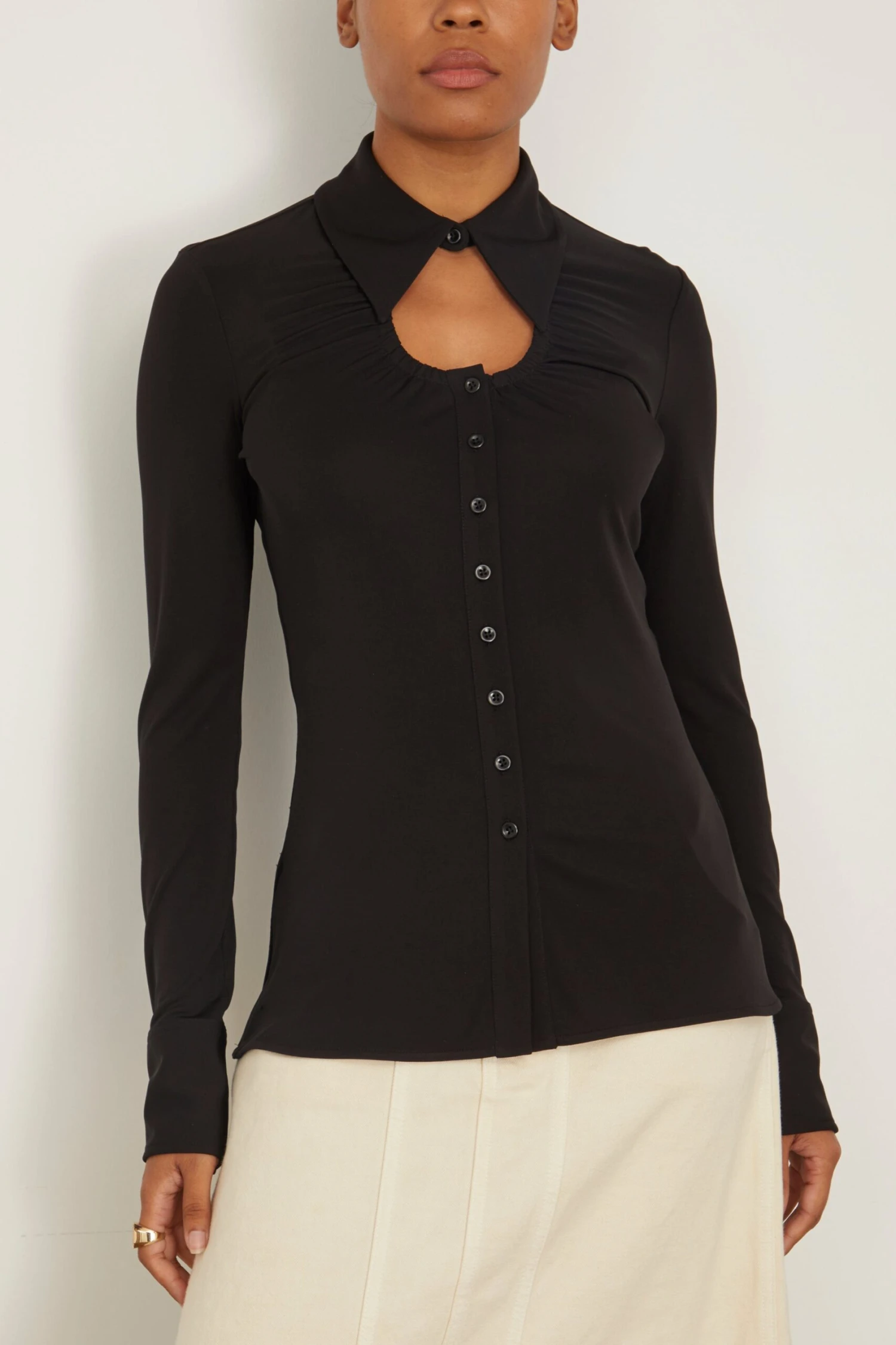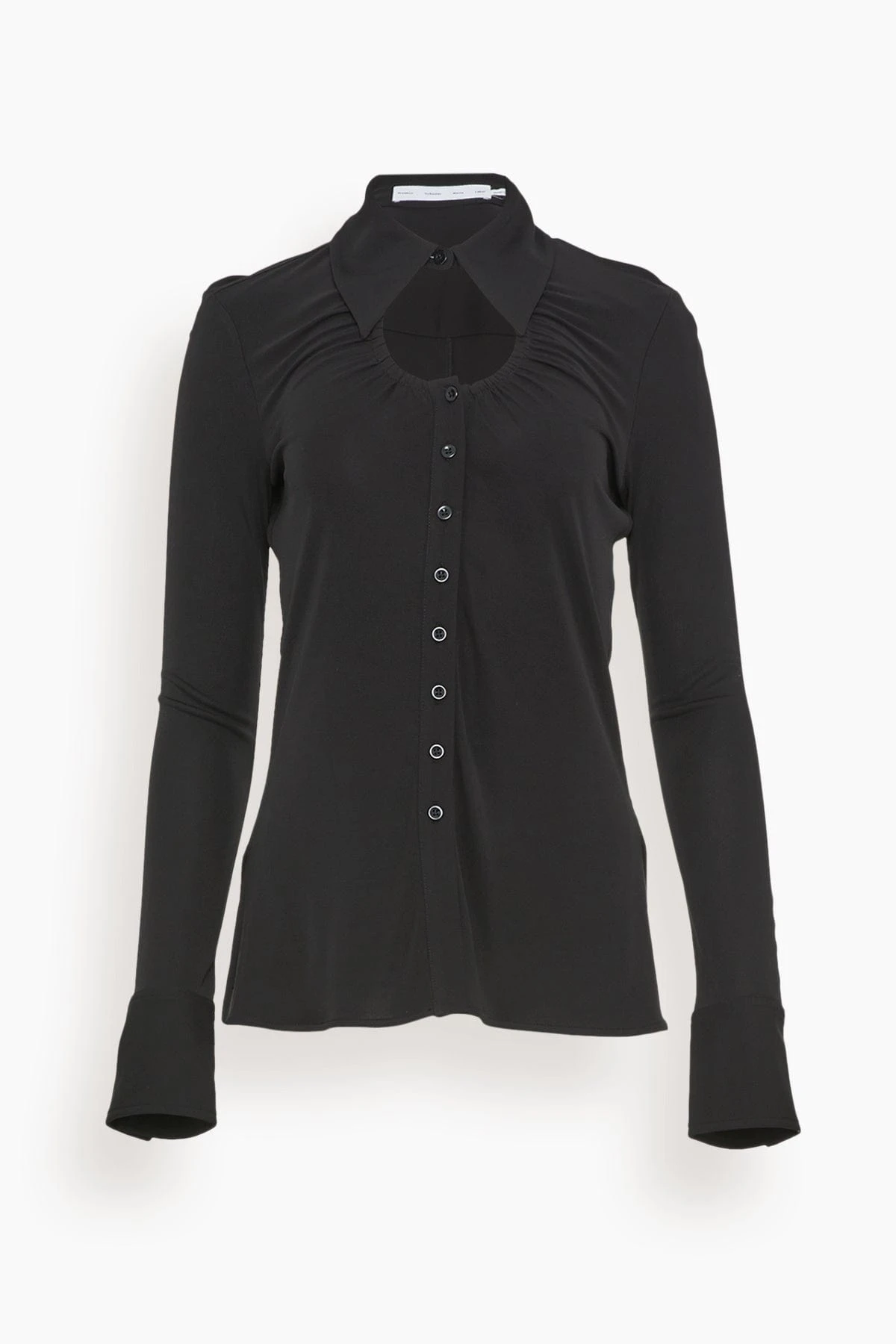 The Proenza Schouler White Label Long Sleeve Jersey Button Top features the unique details you love from this designer. This button down top has a slim silhouette with a cutout keyhole detail. Wear yours tucked in to trousers.