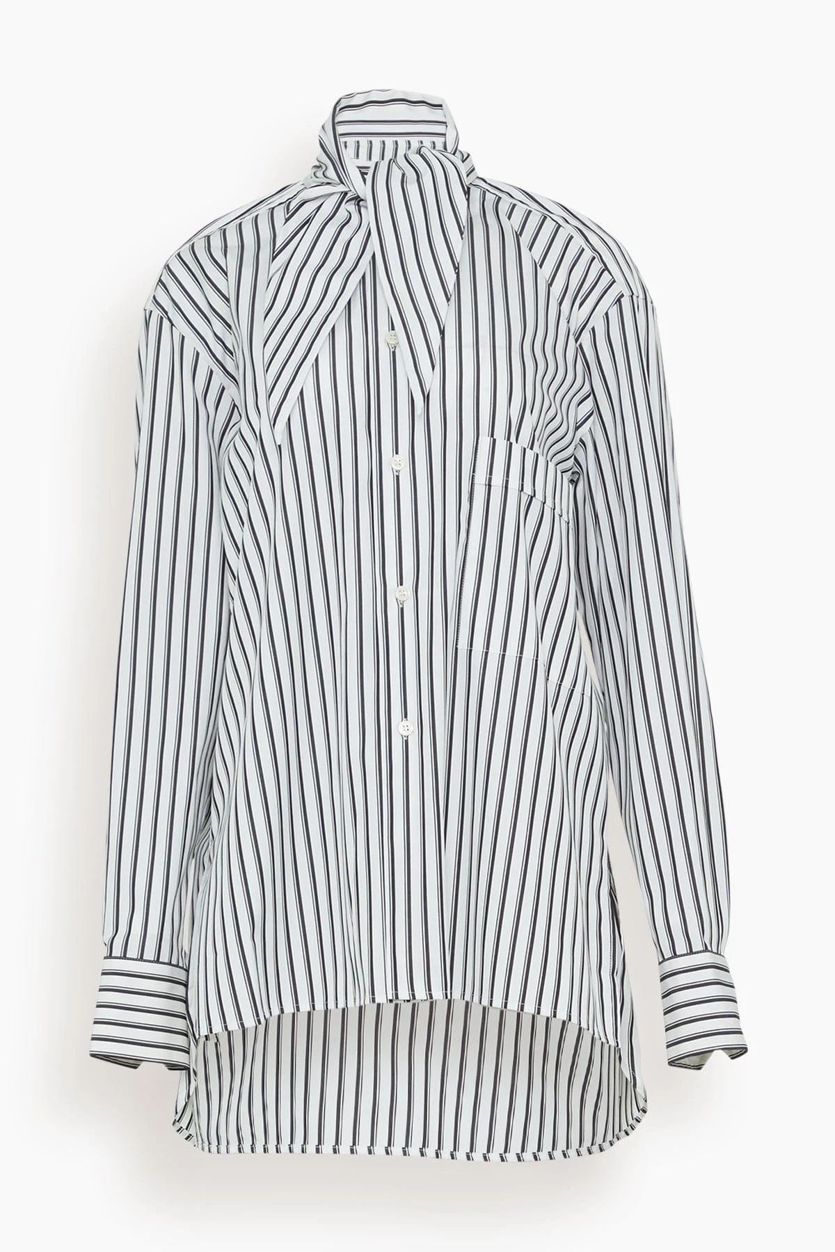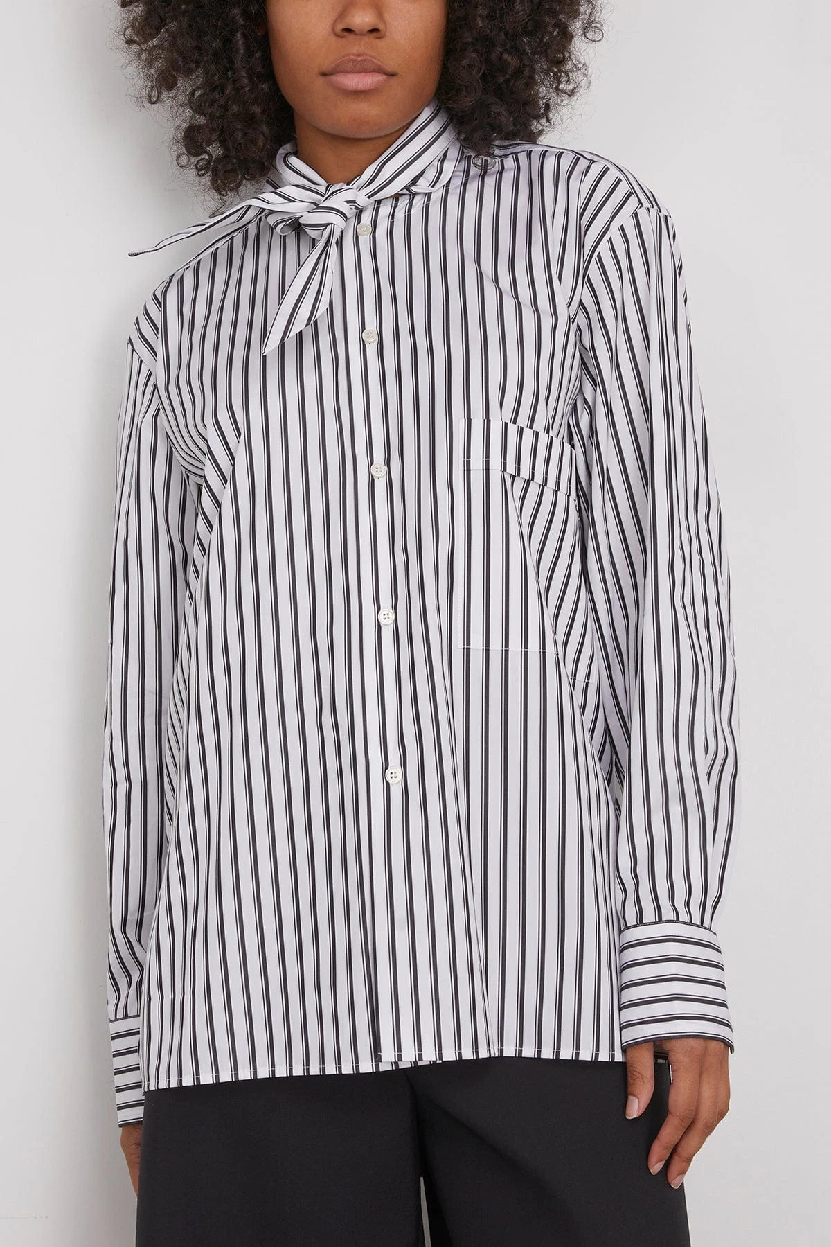 The Plan C Shirt Long Sleeve in White/Black Shirt Stripe will be a staple in your fall and winter wardrobe. This striped shirt has a boxy silhouette with a feminine tie neck detail. Wear yours with jeans and flats.