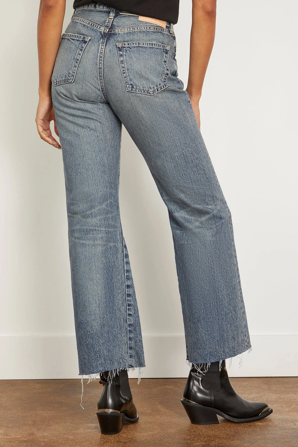 The Moussy Torrey Remake Flare Jean in Blue is a straight leg style with a subtle flare. The Torrey Remake Flare comes in a classic, year-round blue shade and features a high rise, slim fit, ankle-grazing inseam with a raw hem, and fading throughout.