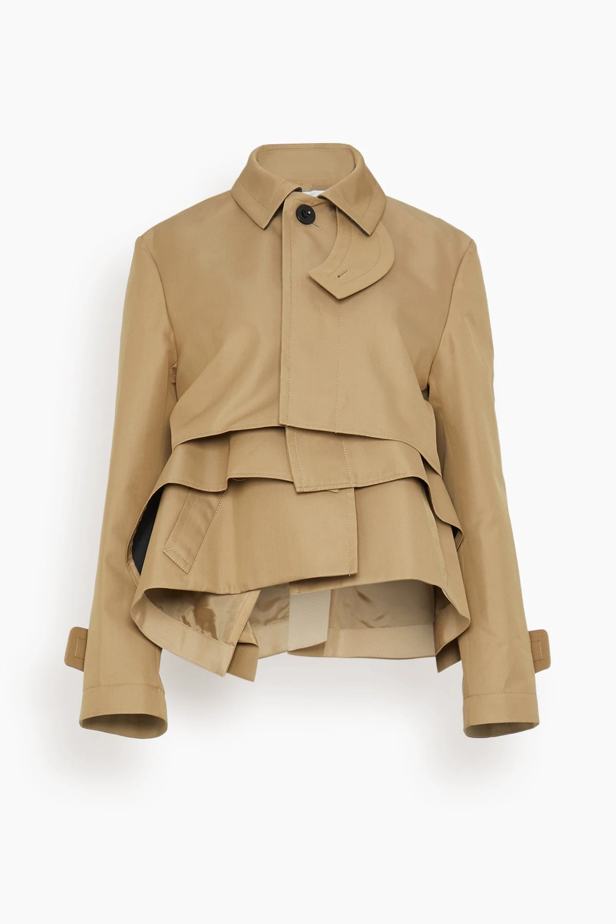 The Sacai Cotton Gabardine Blouson in Beige features a layered tiered design with concealed front button closure and cropped length. This piece features alayered blouson silhouette and is designed with archetypal trench details for a hybrid look.