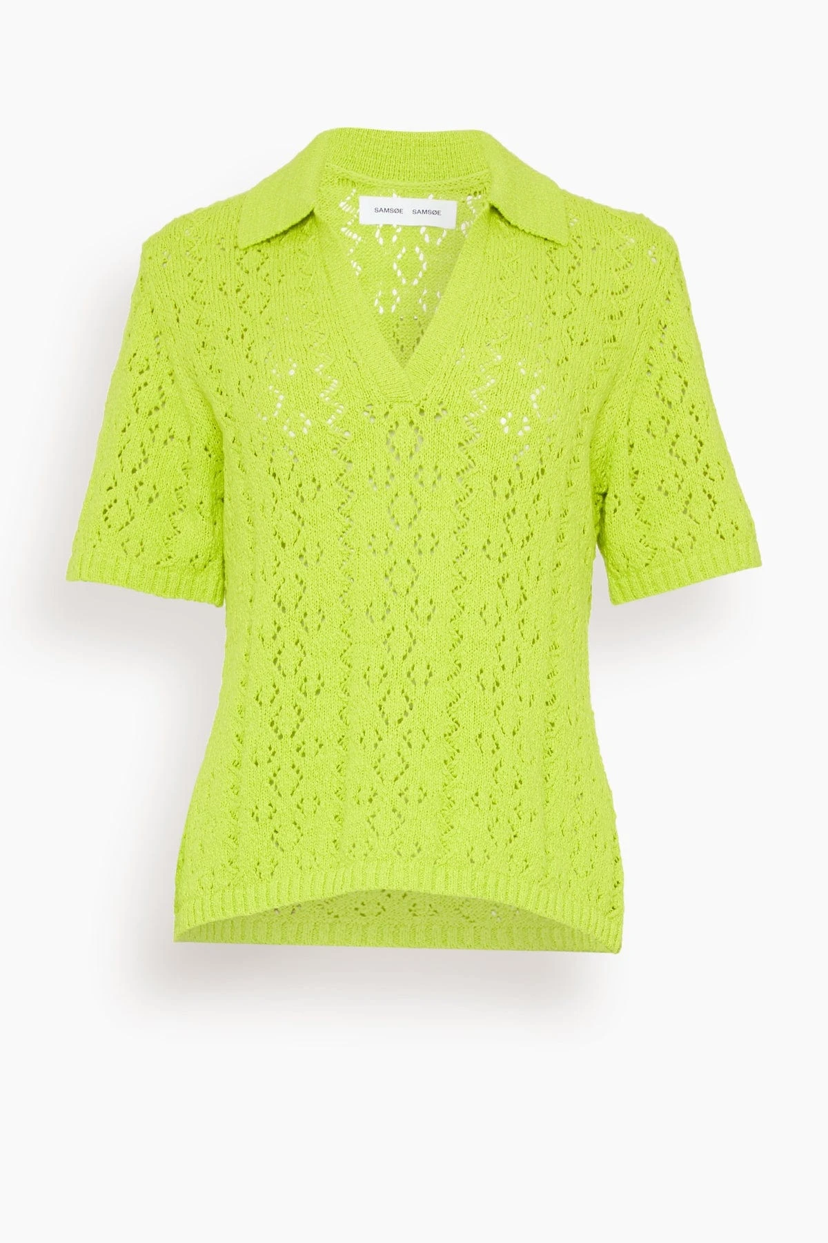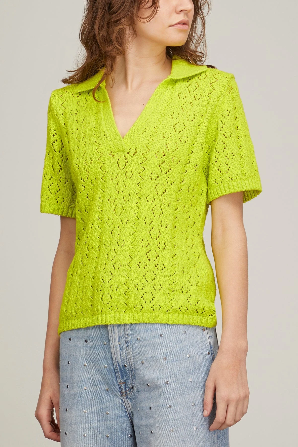 Regular fitting knitted polo neck jumper with short sleeves. Open neck placket with collar. Pointelle lace stitch pattern, organic cotton and recycled cotton blend textured yarn. This product contains organic cotton grown without the use of GMOs or hazardous chemicals and recycled cotton derived from pre- and post consumer waste.