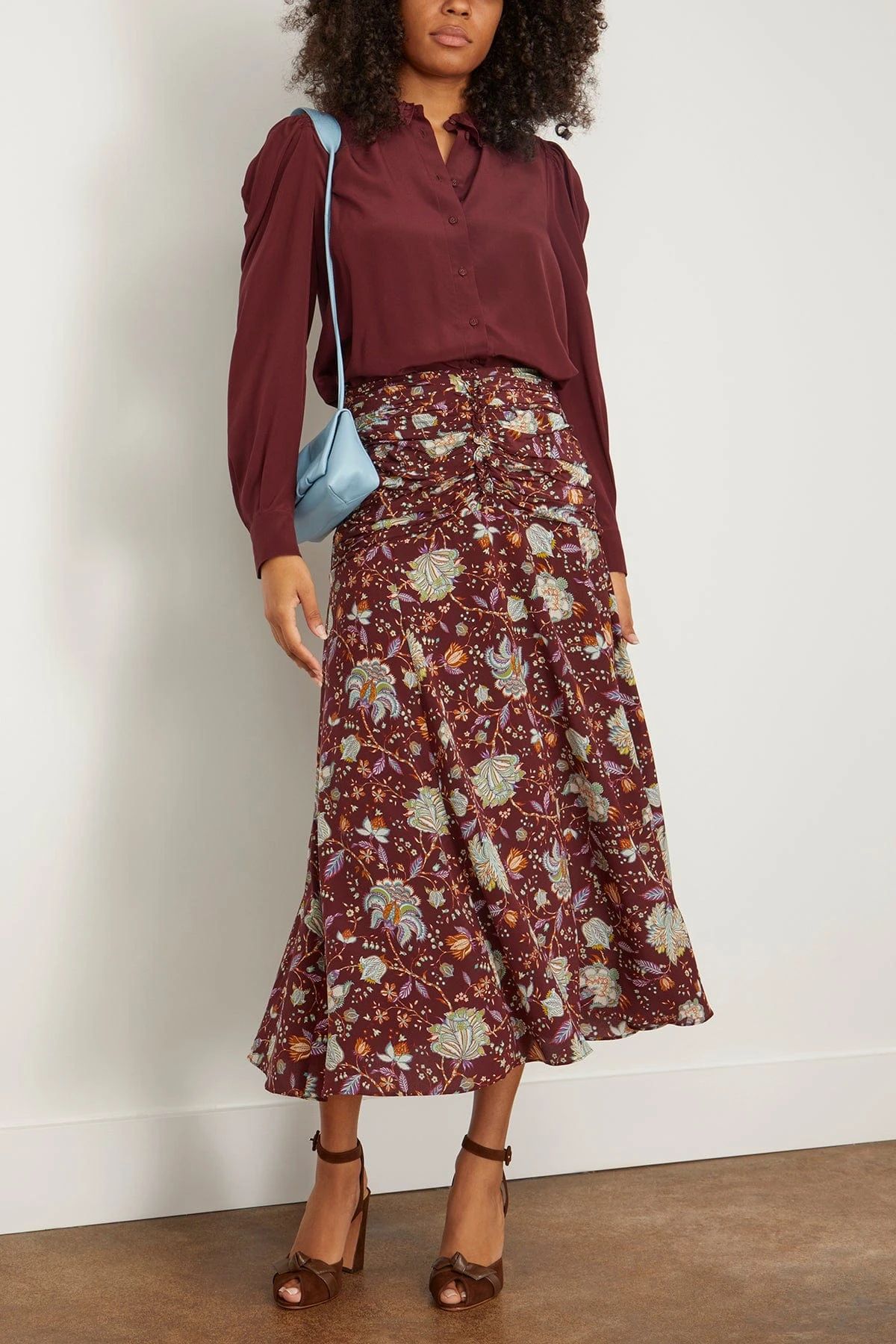 The Ulla Johnson Imani Skirtin Heliotrope is an ultra-elegant silhouette crafted from our lustrous silk crepe de chine. This gorgeous deep red floral midi skirt has graceful ruching and delicate ruffles that define the flattering high waist. We love it paired with a sweater and boots.
