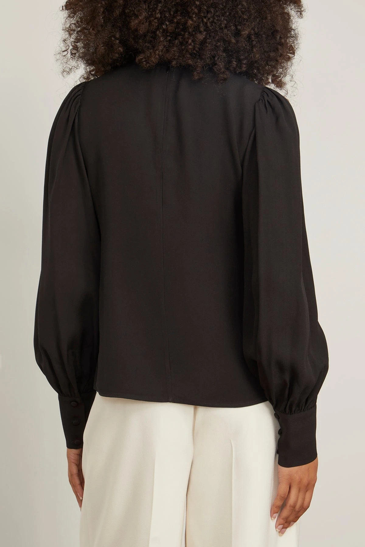 The Ulla Johnson Lilliana Blouse is made from luxurious satin back crepe which features a beautiful, flowing drape. This black blouse has an airy bodice and voluminous sleeves with buttoned cuffs. We love it paired with a slip skirt and heels.