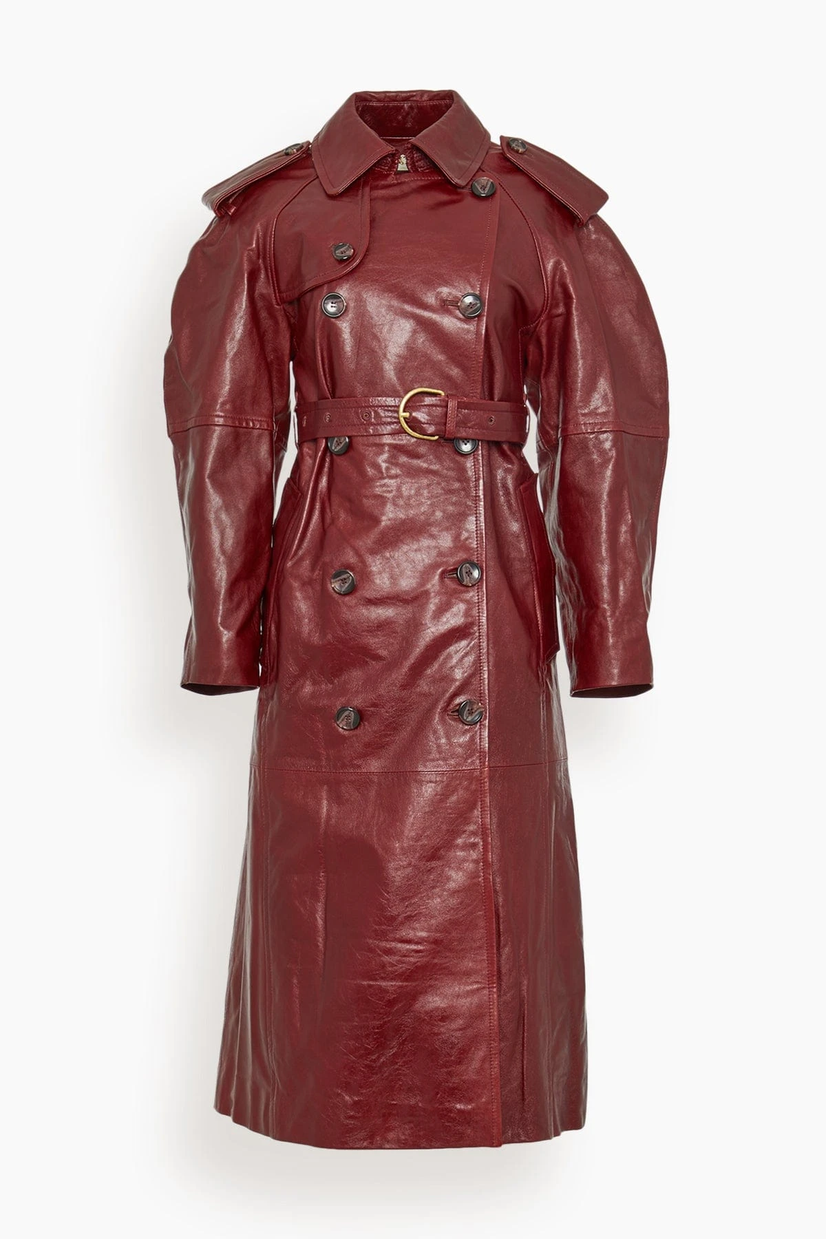 The Ulla Johnson Marlowe Coat in Mahogany is made from a lustrous waxed leather with a slightly crackled surface texture. This gorgeous warm maroon trench coat features a nipped waist and classic utilitarian-style details. We love it paired with a slip dress and heels.