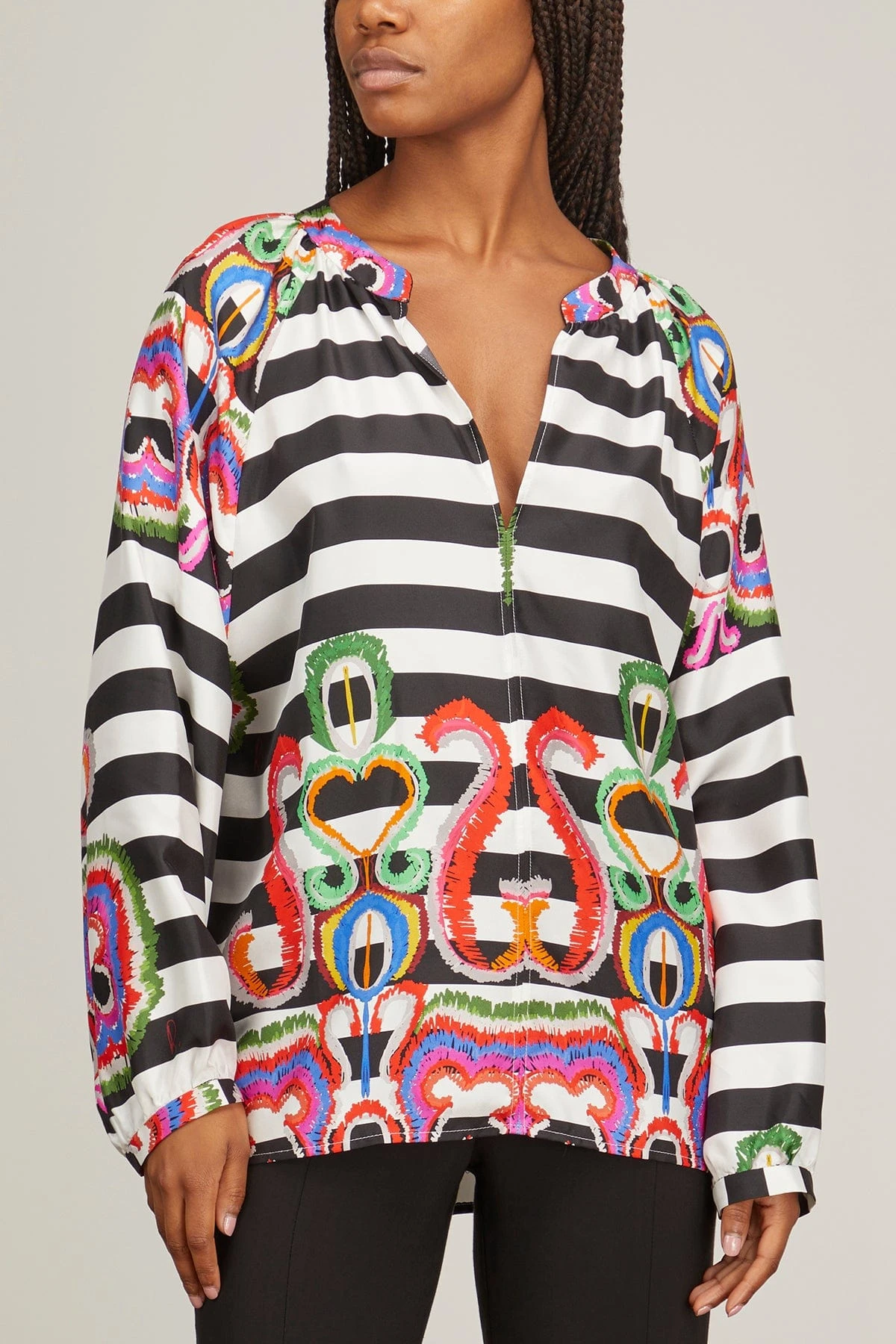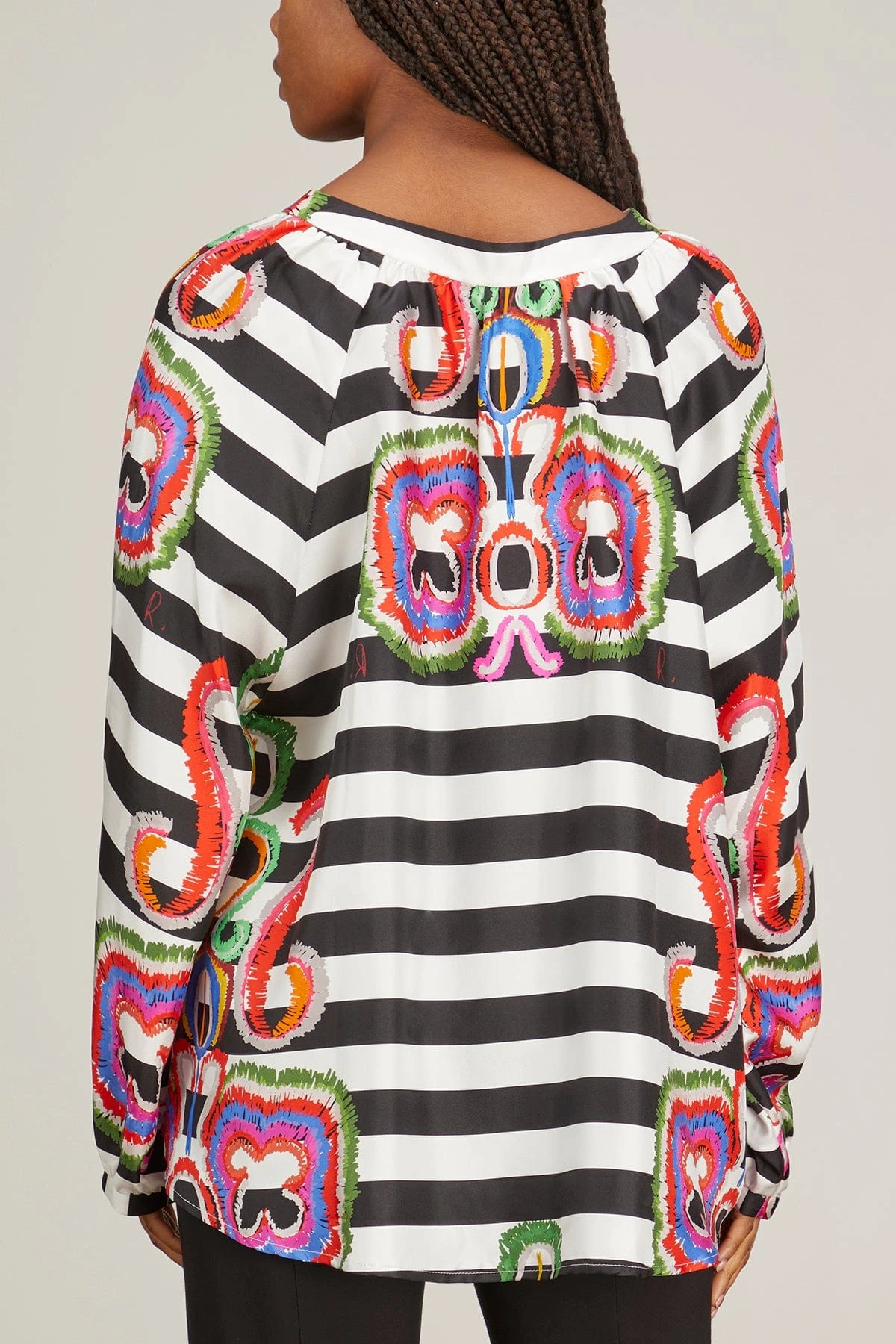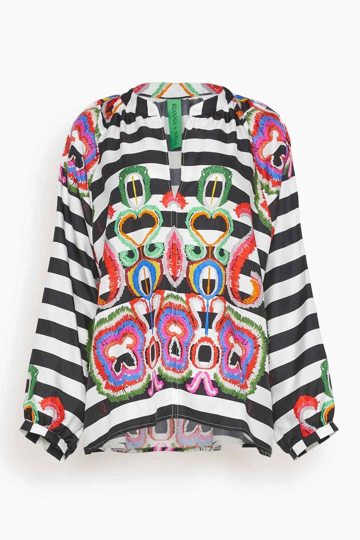 The Rianna & Nina Wide Blouse is a standout piece from their Spring 23 Collection. This blouse features a loose silhouette with blouson sleeves in printed silk. Wear yours with trousers and flats.